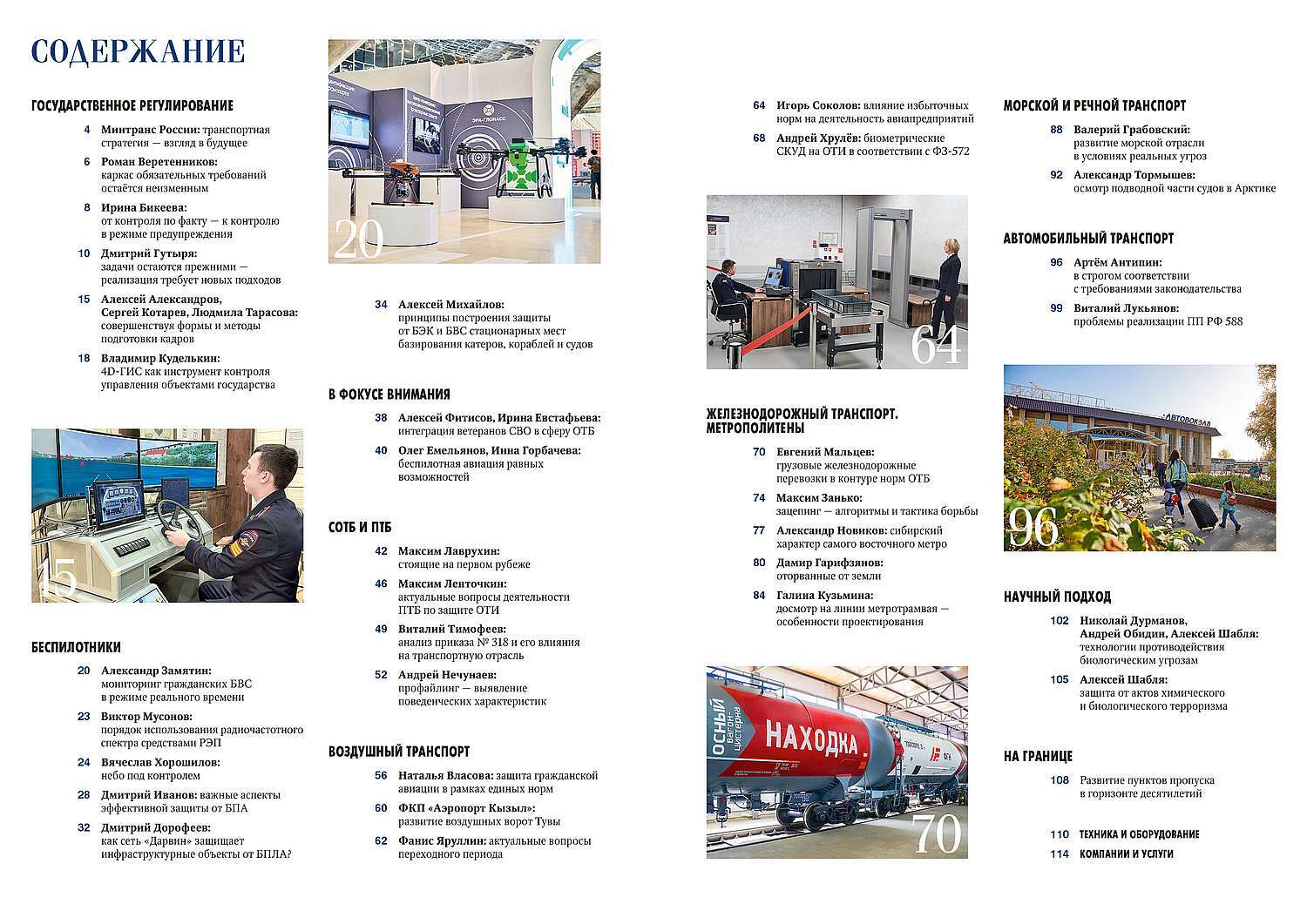На страницах нового номера итогами прошлого года и приоритетными направлениями работы в текущем году с читателям делятся представители федеральных органов исполнительной власти: директор Департамента транспортной безопасности Минтранса России Роман Веретенников, начальник УТБ Росавиации Наталья Власова и заместитель начальника УТБ Ространснадзора Ирина Бикеева.