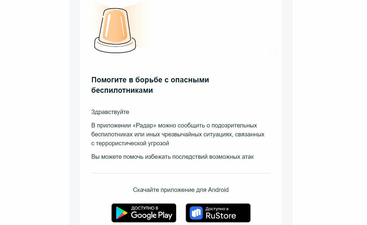 «Помогите в борьбе с опасными беспилотниками! В приложении «Радар» можно сообщить о подозрительных беспилотниках или иных чрезвычайных ситуациях, связанных с террористической угрозой. Вы можете помочь избежать последствий возможных атак», - говорится в письме.